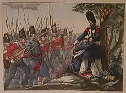 His Grenadier de Waterloo, 1817, with the motto "The Guard Dies and Does Not Surrender" (La Garde meurt et ne se rend pas)—a famous phrase frequently attributed to Cambronne but which he never uttered, and which cannot, perhaps, be traced farther than to this lithograph by Charlet—was particularly popular. It was only towards 1822, however, that he began to be successful in a professional sense. Lithographs (about 2000 altogether), watercolours, sepia drawings, numerous oil sketches, and a few etchings followed one another rapidly. Later in his life there were also three exhibited oil pictures, the especially admired Episode in the Campaign of Russia (1836), the Passage of the Rhine by Moreau (1837), and Wounded Soldiers Halting in a Ravine (1843).[1]