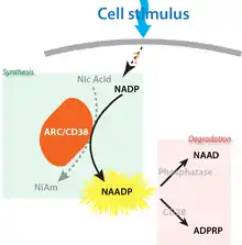 Like any second messenger system, the signal must be terminated and there must be routes for NAADP removal but again, little is known with any degree of certainty. A 2'-3'-phosphatase stimulated by Ca2+ has been proposed in brain[12] and, possibly in pancreatic acinar cells, that catabolises NAADP to inactive NAAD. CD38 has also been found to breakdown NAADP (to ADPRP — see inset).[10] NAADP may also be reduced to NAADPH.[13]