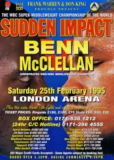 Nigel Benn vs. Gerald McClellan, billed as Sudden Impact, was a professional boxing match contested on 25 February 1995 between WBC super-middleweight champion Nigel Benn and former WBC middleweight champion Gerald McClellan. Benn defeated McClellan via tenth-round knockout after McClellan was counted out while down on one knee. Shortly after the match ended, McClellan collapsed and fell into a coma for two weeks.