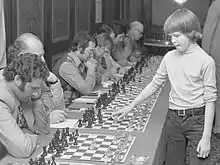 Short learned chess at age five from his father.[5] A chess prodigy, Short first attracted significant media attention as a 10-year-old, by defeating Viktor Korchnoi, then ranked No. 2 in the world, in a simultaneous exhibition in London over 31 boards, where Short was the only victor. He was virtually self-taught. In 1977 he became the youngest ever participant in the British Chess Championship by qualifying through the North West Zonal three days before his 12th birthday. In the event itself, he defeated ten-time British champion Jonathan Penrose, and finished with 5/11, an excellent showing for a debutant.[6] Short dominated British youth chess during this period, and earned a Master rating with his showing in the 1977 British finals. Two years later, in the British Championship at Chester, Short tied for first place with John Nunn and Robert Bellin, earning his first International Master norm; Bellin won the title on tiebreak. Later in 1979, Short tied for first place in the World Championship for players under age 16, the World Cadet Championship, at Belfort, France, but lost to Argentinian Marcello Tempone on tiebreak.[7] He became (at the time) the youngest International Master in chess history by scoring 8/15 in the Hastings Premier in 1979/80, breaking Bobby Fischer's record from 1958.[8] Participating in four World Junior Championships (1980–83), Short achieved his best result during his first attempt, when he placed second to Garry Kasparov in 1980 at Dortmund. Short represented England in international team play for the first time at the 1983 European Team finals in Plovdiv. He was awarded the grandmaster title in 1984, aged 19—becoming the youngest grandmaster in the world at the time.