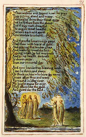 Blake's Songs of Innocence is an illuminated anthology first printed in 1789.[2] Each poem contains an etched illustration by Blake, combining his poetry with intricate drawings. Songs of Innocence is a lyric collection that depicts an idyllic world before adulthood, where the spirit of children is still religiously pure.[2] In some of the poems in this work, such as "The Chimney Sweeper" and "The Little Black Boy", Blake uses irony and rhetoric to portray the corruption of innocence in youth. Songs of Innocence were later combined with Blake's Songs of Experience, becoming Songs of Innocence and Experience and bringing the total number of poems in the work to thirty-one. The two collections were printed combined as well as separately from 1794.[2]