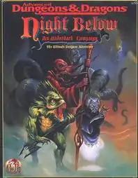 Night Below is an adventure for four to eight first-level characters that will allow them to reach 14th level by the conclusion. The adventure breaks down into three parts (each with its own beginning, middle, and ending), each contained within its own booklet and fold-out, double-sided color map, with tactical maps for miniatures.[1] The adventure begins with the player characters acting as couriers for a wizard, when they are waylaid by band of brigands trying to capture the party's spellcasters.[1] Play is initially conducted aboveground in a rural setting, which provides many small-scale encounters from which characters can gain experience, treasure, and clues.[1] There is a village that characters can use as a base, with its own supporting cast of Non-player characters for potential friends, including rangers, a druid, and a wizard.[1] The players then unearth the entrance to a vast cave system, where they will contend with the sinister plot hatching far below.[1]