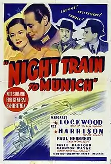 Night Train to Munich is a 1940 British-American thriller film directed by Carol Reed and starring Margaret Lockwood and Rex Harrison. Written by Sidney Gilliat and Frank Launder, based on the novel Report on a Fugitive by Gordon Wellesley, the film is about an inventor and his daughter who are kidnapped by the Gestapo after the Nazis march into Prague in the prelude to the Second World War. A British secret service agent follows them, disguised as a senior German army officer pretending to woo the daughter over to the Nazi cause.[2]