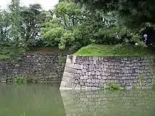 Nijō Castle (二条城, Nijō-jō) is a flatland castle in Kyoto, Japan. The castle consists of two concentric rings (Kuruwa) of fortifications, the Ninomaru Palace, the ruins of the Honmaru Palace, various support buildings and several gardens. The surface area of the castle is 275,000 square metres (27.5 ha; 68 acres), of which 8,000 square metres (86,000 sq ft) is occupied by buildings.