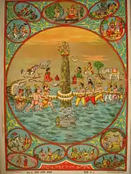 As per another legend, when Devas (celestial deities) and Asuras (demons) were churning the Ocean of Milk, Vishnu helped them as a tortoise Kurma holding the mount. The snake Vasuki using as a rope for churning emanated poison that turned the skin colour of the tortoise from blue to black. Vishnu reached out to Brahma for resolution, who advised him to worship Shiva. It is believed that Sun and moon are the two eyes of Shiva. He opened his left moon eye to ease the pain of Vishnu with the cold lunar rays. On account of it, the presiding deity came to be known as Nilathingal Thunda Perumal.[5]