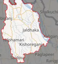 Nilphamari (Bengali: নীলফামারী জেলা, Nilphamari Jela also Nilphamari Zila) is a district in Northern Bangladesh. It is a part of the Rangpur Division. It is about 400 kilometres to the northwest of the capital Dhaka. It has an area of 1,547 square kilometres (597 sq mi). Nilphamari is bounded by Rangpur and Lalmonirhat in east, Rangpur and Dinajpur in south, Dinajpur and Panchagarh in west, Cooch Behar of India in north.[3] There are many rivers in Nilphamari such as the Tista, Buritista, Isamoti, Jamuneshwari, Dhum, Kumlai, Charalkata, Sorbomongola, Salki, Chikli, Deonai and many more.[4]