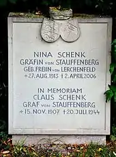 Countess Nina von Stauffenberg (German: Elisabeth Magdalena Schenk Gräfin von Stauffenberg; 27 August 1913 – 2 April 2006) was the wife of Colonel Claus Schenk Graf von Stauffenberg, the leader of the failed plot to assassinate Adolf Hitler on 20 July 1944. Following the plot's failure, she was arrested and imprisoned, during which time she delivered her youngest child.