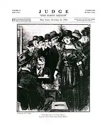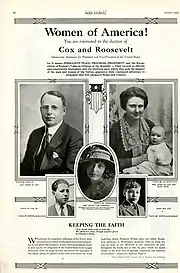 In 1918, President Wilson faced a difficult midterm election and would have to confront the issue of women's suffrage directly.[42] Fifteen states had extended equal voting rights to women and, by this time, the President fully supported the federal amendment.[49][50] A proposal brought before the House in January 1918 passed by only one vote. The vote was then carried into the Senate where Wilson made an appeal on the Senate floor, an unprecedented action at the time.[51] In a short speech, the President tied women's right to vote directly to the war, asking, "Shall we admit them only to a partnership of suffering and sacrifice and toil and not to a partnership of privilege and right?"[42] On September 30, 1918, the proposal fell two votes short of passage, prompting the NWP to direct campaigning against senators who had voted against the amendment.[50]