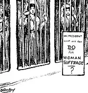 In 1914 the constitutional amendment proposed by Sargent, which was nicknamed the "Susan B. Anthony Amendment", was once again considered by the Senate, where it was again rejected.[28] In April 1917 the "Anthony Amendment", which eventually became the Nineteenth Amendment, was reintroduced in the House and Senate. Picketing NWP members, nicknamed the "Silent Sentinels", continued their protests on the sidewalks outside the White House. On July 4, 1917, police arrested 168 of the protesters, who were sent to prison in Lorton, Virginia. Some of these women, including Lucy Burns and Alice Paul, went on hunger strikes; some were force-fed while others were otherwise harshly treated by prison guards. The release of the women a few months later was largely due to increasing public pressure.[46]