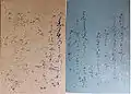 In 1929, The two original volumes: the second volume of poems by Ki no Tsurayuki and the volume of those by Lady Ise, were dismembered into separate sheets and sold to collectors for the purpose of gaining funds for Musashino University. Masuda Takashi , manager of this sale, named fragments Ishiyama-gire. Most of them are mounted to hanging scroll format.