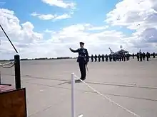41 Squadron's standard, originally presented only six months previously, was handed over to 141 Squadron on 16 January 1958 in a short ceremony attended by Air Officer Commanding-in-Chief, Fighter Command, Air Chief Marshal Sir Thomas Pike, and by 11 Group's Air Officer Commanding, Air Vice-Marshal Victor Bowling, himself a veteran 41 Squadron pilot from 1935.[36]