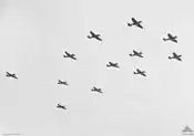 After arriving in the UK, No. 451 Squadron was issued with Mark XVI Spitfires and based at RAF Hawkinge in Kent from 2 December 1944. It began flying combat operations in early 1945 and was initially used to escort RAF Bomber Command heavy bombers and No. 2 Group RAF medium bombers during daylight raids.[19] From 14 February the squadron was based at RAF Matlaske from where it operated alongside No. 453 Squadron RAAF against V-2 rocket launch sites and railway targets in the Netherlands. From 20 March 1945 the two squadrons were mainly focused on attacking German transportation targets after the V-2 campaign against the UK ended.[20] As the war in Europe draw to a close No. 451 Squadron's activities decreased, and it flew its last attack sorties from the UK on 3 April. The squadron flew only 61 operational sorties for the remainder of April and none in May.[21]