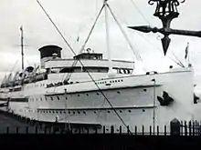 As he prepares to embark, George's attention is drawn to the arrival of the more famous T.T. competitors -such as Bert Tyldesley- who embarks onto the steamer with the secretary of boss of the Rainbow Motorcycle Company, Florrey Dibney (Florence Desmond). George attempts to be included in a photograph with Tyldesley and another T.T. rider -Norton-, but as they assemble for the photograph, George observes a stray cargo crate heading towards them. In order to save Florrie from being struck by the crate, George pushes her out of the way and consequently knocks her hat over the side of the ship.
