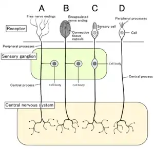 ![]() Four types of sensory neurons and their receptor cells. Nociceptors shown as free nerve endings type A | |