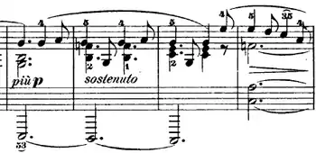 The Nocturne in G major is initially marked as andantino and is in 6/8 meter, remaining so for all 139 measures. It is written in the style of a Venetian barcarolle,[7] which, according to Dubal, is engendered by the main theme's "euphonious thirds and sixths".[9] Huneker commented that "pianists usually take the first part too fast, the second too slowly" and play the piece like an étude.[11] Friskin commented that the sixths "require care to get evenness of tone control."[8] The piece has the structure A–B–A–B–A, somewhat unusual for a Chopin nocturne. The melody in thirds and sixths is similarly unusual, all other Chopin nocturnes opening with single-voice melodies.