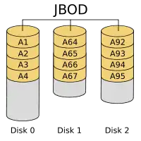 JBOD (abbreviated from "Just a Bunch Of Disks"/"Just a Bunch Of Drives") is an architecture using multiple hard drives exposed as individual devices. Hard drives may be treated independently or may be combined into one or more logical volumes using a volume manager like LVM or mdadm, or a device-spanning filesystem like btrfs; such volumes are usually called "spanned" or "linear | SPAN | BIG".[2][3][4] A spanned volume provides no redundancy, so failure of a single hard drive amounts to failure of the whole logical volume.[5][6] Redundancy for resilience and/or bandwidth improvement may be provided, in software, at a higher level.