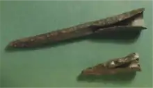 In the Middle Bronze (MB) Age (end of 3rd–middle of 2nd millennium BCE) hundreds of metal objects were found. The development of more complex weapons (longer daggers, swords, complex battle axes, etc.) was possible by alloying the copper with arsenic or with tin. All the MBII weapons that were analyzed were made of copper alloyed either with tin (14%–2% Sn) or with arsenic (4.3%–0.5% As), sometimes with a mixture of both usually in low concentrations. These changes in the metal properties of weapons are also reflected in the composition of small objects, like toggle pins that were probably made mainly from re-melting of scrap.[13] Lead (Pb) started to play a greater role as a major alloy for thick casts of copper-based objects, mainly of battle axes [14] during this period.