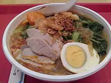 - Curry laksa – rice noodles in a coconut curry soup.[6] Topped with prawns or chicken, cockles, bean sprouts, tofu puffs and sliced fish cakes. Boiled egg may be added. Served with a dollop of sambal chilli paste and Vietnamese coriander. Popular in Singapore.