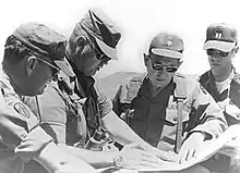 Despite the brigade's otherwise-controversial performance record, Schwarzkopf was quickly regarded as one of its best combat commanders.[48] He aggressively stepped up patrols and operations to counter Viet Cong infiltration in the battalion's sector.[49] He developed his leadership attitudes during this command. Fellow commander Hal Moore later wrote that during his time in Vietnam, Schwarzkopf acquired his well-known temper and argued via radio for passing American helicopters to land and pick up his wounded men.[50] He also showed a preference of leading from the front and prided himself on avoiding the rear areas, which he called a "cesspool."[2][51]
