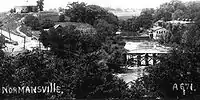 Normansville was originally called Upper Hollow; it was named for the deep ravine carved by the Normans Kill in which it was located. Further downstream was Lower Hollow, later named Kenwood. Upper Hollow had its start in 1805 with the construction of the Delaware Turnpike, which ran from the City of Albany to Otego (which then was part of Delaware County).[1] The Turnpike was carried over the Normans Kill ("kill" is the Dutch word for "stream") by a 100-foot-long (30 m) wooden bridge. Northwest of this bridge was a toll gate. The wood bridge was washed away by a freshet in 1869[2] (one year after the turnpike company had abandoned the Turnpike) and the Town of Bethlehem built an iron bridge in its place.[1][2]