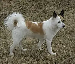 The Norrbottenspets is a small to medium sized, compact and robust breed with typical spitz features.[4] Slightly smaller than the Finnish Spitz, the breed standard states dogs should stand between 43 and 47 centimetres (17 and 19 in) with bitches being slightly smaller, standing between 40 and 44 centimetres (16 and 17 in); they typically weigh between 11 and 15 kilograms (24 and 33 lb).[1][2][5] The breed has a thick, dense double coat that protects the breed well during arctic winters; the outer coat is hard, short and straight whilst the undercoat is fine and dense.[4] The breed can be seen in all colours, although white with red, yellow, cream, tan or black markings is most common; the breed standard states they should be white with either yellow or red patches.[1][4][5] The breed has a wedge-shaped head with erect ears; their body is strong and is as long as it is tall with a deep chest; their tail is long and is carried high, curled over their back is typical of spitz dogs.[4]