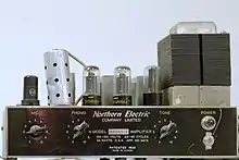 During the First World War Northern Electric manufactured the Portable Commutator, a one-wire telegraphic switchboard for military operations in the field. In 1922, Northern started to produce, for $5, the "Peanut" vacuum tube, which required only a single dry-cell battery. The use of alternating current was still under development during this time. The "Northern Electric Peanut tube was the smallest tube made, and drew only one-tenth of an ampere and was the most remarkable radio frequency amplifier ever made."[24] During the 1920s Northern Electric made kettles, toasters, cigar lighters, electric stoves, and washing machines.[25] In January 1923, Northern Electric started to operate an AM radio station with call letters CHYC, in the Shearer Street plant, and much of the programming was religious services for the Northern Electric employees and families in the community. In July 1923, CHYC-AM was the first radio station to provide entertainment to the riders of the transcontinental train, in a parlor car fitted with a radio set to receive the broadcast as it left Montreal and traveled west.[26] Later in the 1920s, Northern created the first talking movie sound system in the British Empire for a theater in Montreal.[25]