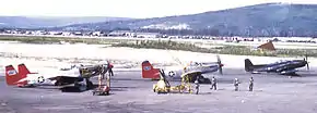 F-82Gs from Far East Air Force were also sent to Alaska, as jets took over combat duties over the skies of Korea. The FEAF F-82s, however, arrived in a badly corroded condition. Also, many of these aircraft which were sent to the 449th had high time on their airframes from long bomber escort and air defense flights, as well as the stress from combat duty in Korea causing many of them to be difficult to maintain.[10] After four months at the 39th Air Depot Wing at Elmendorf, most were scrapped.[12]