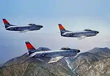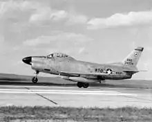 The North American F-86D Sabre (sometimes called the "Sabre Dog"[1]) was an American transonic jet all-weather interceptor of the United States Air Force and others. Based on the North American F-86 Sabre day fighter, the F-86D had only 25 percent commonality with other Sabre variants, with a larger fuselage, a larger afterburning engine, and a distinctive nose radome.