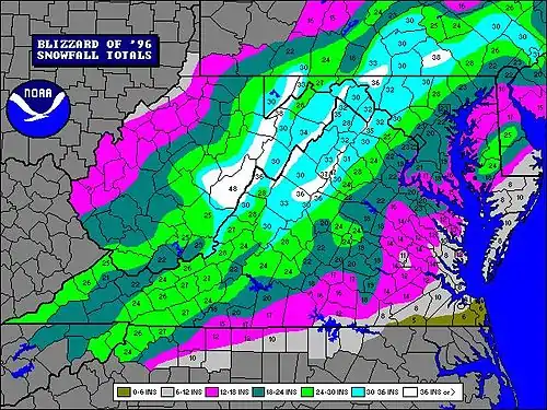 Most of Virginia was impacted with the more central and western parts receiving one to three feet (30 to 91 cm) of snow.[5] Roanoke got a record-breaking 23 inches (58 cm). The heaviest snow fell in Page County, with around 37 inches (94 cm). Snowfall reached three feet (91 cm) in the Shenandoah Valley and exceeded two feet (61 cm) in much of the Virginia mountain and Piedmont areas. Gov. George Allen declared a state of emergency as power lines went down, people were trapped in their houses, and at least eight weather-related deaths occurred. High winds that accompanied the blizzard caused white out conditions and drifts of up to 10 feet (300 cm) in Patrick County.