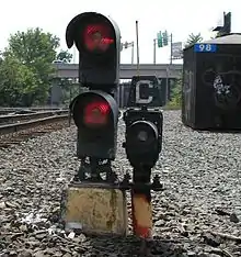 In 1954, the PRR experimented installing red lenses in the horizontal position of the upper head to help increase the at distance visibility of absolute Stop signals at Overbrook interlocking.[8] Under the Penn Central and later Conrail it became standard practice to add these red lenses to high position lights and even some pedestal signals. The Norfolk and Western modified its signals to use red and green lenses in the upper head Stop and Clear positions and yellow lenses everywhere else. In the 1980s Amtrak modified most of its former-PRR position lights to use the equivalent color light colors in all of the positions of both heads. Internally referred to as position color lights, these are not to be confused with color position lights described below, which while functionally similar are structurally considerably different.[7]
