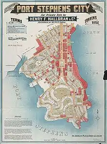 Port Stephens was under consideration as the main seaport for New South Wales,[6] as well as the national capital, and a large city-style subdivision of the peninsula was designed by Walter Burley Griffin, with an architectural plan drawn by his wife Marion, on behalf of the landowner, Henry Halloran, a developer and surveyor.[7] Griffin's plans included two railway stations, a business district, federal and state office sites, a factory district, car parks, wharves, parks and playgrounds.[8] They were approved by Stroud Shire Council on 6 May 1918.[9] Many dirt roads, still visible from the air, date from the original subdivision.[8][5]
