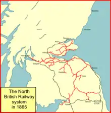 The NBR grew to have, by the summer of 1865, about 450 mi (720 km) of route, almost equally divided between double- and single-track. In addition it was working another 40 mi (64 km) of single track for independent companies.[29]