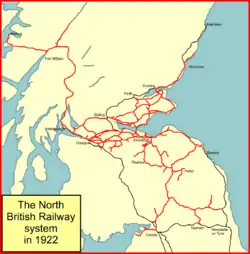 At the grouping of the railways in 1923, the North British Railway was the largest railway company in Scotland, and the fifth largest in the United Kingdom. In that year it became a constituent of the new London and North Eastern Railway.