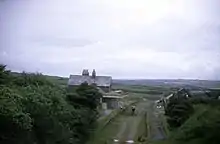 Camelford station (50.6389°N 4.6871°W) was situated more than 2 miles (3.2 km) from the town "at a road junction in wild country almost devoid of trees".[18] The station had a passing loop with the station building (including canopy) and signal box on the up platform. Like the waiting shelter on the down platform, the buildings were constructed from local stone. As elsewhere on the line, no footbridge was provided. Cattle pens were provided on the single siding, with the goods shed on a loop between the siding and headshunt.