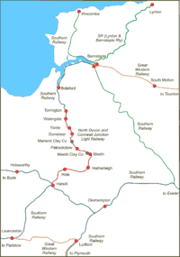 The conversion from a tramway was overseen by Colonel Stephens, the famous owner and operator of marginal English and Welsh railways. Although in construction details typically Stephens this was visually a Southern Railway branch line. It survived in independent status until nationalisation of the railways in 1948, and continued in operation until 1 March 1965. The Exmoor Ranger railtour was exceptionally worked through the entire line on 27 March 1965.[2] The northern part from Meeth and Marland, which was reconstructed from the narrow gauge railway, continued to carry ball clay, but not passengers, until August 1982 (Thomas[1] calls the siding "Marsland" on page 77 but this is an error[3][4][5]).