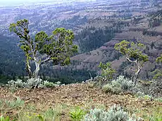 The North Fork John Day Wilderness is composed of rolling benchlands, steep ridges, alpine lake basins, and the granite outcrops of the Greenhorn Mountains at an elevation of 8,100 feet (2,500 m). It encompasses two entire subranges of the Blue Mountains—the Greenhorn Mountains and the ragged Elkhorn Mountains.[3] A continuous vegetative canopy covers most of the land, including dense virgin stands of conifer species like Douglas-fir, white fir, western larch and lodgepole pine.[2] The headwaters of several waterways are located in the wilderness, including Bull Creek, Baldy Creek, and Crawfish Creek, as well as the North Fork John Day River, 39 miles (63 km) of which are designated Wild and Scenic.[2][3]
