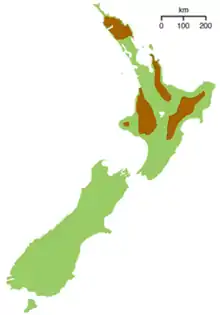 Brown kiwi are found throughout the North Island, occurring near Northland, Coromandel, Eastern North Island, Aroha Island, Little Barrier Island, Kawau Island, Ponui Island, and the Whanganui Region. The North Island brown kiwi has demonstrated a remarkable resilience: it has adapted to live on scrub-like farm land, pine (an introduced tree) plantations, and their native forests, but it still prefers dense, sub-tropical and temperate forest.[12]
