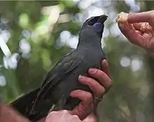 The North Island kōkako (Callaeas wilsoni) is an endangered forest bird which is endemic to the North Island of New Zealand. It is grey in colour, with a small black mask. It has blue wattles (although this colour develops with age: in the young of this bird they are actually coloured a light pink). Because of its wattle, the bird is sometimes locally called the blue-wattled crow, although it is not a corvid.