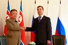 In August 2011, ahead of Kim Jong-il's visit to Russia, the Kremlin said that it was providing food assistance including some 50,000 tons of wheat.[19] A few days after Kim's visit the presidential envoy to Russia's Far East, Viktor Ishayev, said wheat deliveries would begin via the town border of Khasan in September.