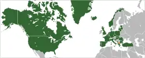 North Macedonia is a member state of the North Atlantic Treaty Organization (NATO). In 1995, the country joined the Partnership for Peace. It then began taking part in various NATO missions, including the International Security Assistance Force and the Resolute Support Mission in Afghanistan. At the 2008 Bucharest summit, Greece vetoed the country's invitation to join; however, NATO member states agreed that the country would receive an invitation upon resolution of the Macedonia naming dispute.[2] Following an agreement in June 2018 to rename the country, representatives of NATO member states signed a protocol on the accession of North Macedonia to NATO on 6 February 2019.[3] Over the next thirteen months, all of NATO's 29 member states ratified the protocol. The accession protocol entered into force on 19 March 2020, allowing North Macedonia to deposit its instrument of accession and thereby become a member state of NATO on 27 March 2020.