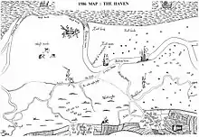 An "eye" is an area of higher ground in the marshes, dry enough to support buildings. Cley Eye had been farmed since the earliest human habitation, and was 28 ha (70 acres) in extent in 1651, but is much reduced by coastal erosion.[11][12] The Eye and its Saxon barn were accessed by an ancient causeway, passable at low tide.[12] A 1588 map showed "Black Joy Forte" in the same area, which may have been intended as a defence against the Spanish Armada, but was never completed.[3][13] On the other side of the Glaven, Blakeney Eye had a ditched enclosure during the 11th and 12th centuries, and a building known as "Blakeney Chapel", which was occupied from the 14th century to around 1600, and again in the late 17th century. Despite its name, it is unlikely that it had a religious function. Nearly a third of the mostly 14th-to-16th-century pottery found within the larger and earlier of the two rooms was imported from the continent,[14][15] reflecting the Glaven ports' importance in international trade at this time.[16][17]