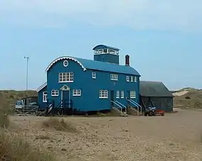 Royal Artillery military fortifications were established at Cley beach, including two 6-inch (15.24 cm) guns, five buildings, two pillboxes, a minefield,[3] and concrete anti-tank blocks. A spigot mortar emplacement and an Allan Williams Turret machine gun emplacement were sited closer to the village. One of the pillboxes and remains of the beach gun emplacements were still surviving as of 2012.[25] The military camp accommodated 160 men and was later used to hold prisoners of war. Near the end of the war, the camp was used to house East European refugees, and was finally pulled down in 1948. Many of the wartime buildings were destroyed by the Royal Engineers in 1955, but the generator house was taken over by the coastguard service as an observation post. It was acquired by the NWT in 1983, and the upper part was used as a look-out, while the larger lower section became a beach café.[26] The building was overwhelmed by shingle in a storm in 2008, and subsequently demolished.[27]