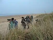 The SSSI's north-facing east coast location can be favourable for huge numbers of migrating birds when the weather conditions are right.[45][46] These may include vagrant rarities.[47] A black-winged stilt, which acquired the nickname "Sammy", arrived at Titchwell in 1993 and became a permanent resident up to its disappearance in 2005.[48] Other major rarities included a western sandpiper at Cley in 2012,[49] a rufous-tailed robin at Warham Greens in 2011,[50] and a black-winged pratincole at Titchwell in 2009.[51]