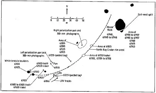 North Ray crater is approximately 1 km in diameter and approximately 240 m deep.[2] The astronauts observed that the upper 50 m of the slope is gentle, but that it becomes steep below 50 m, and they could not observe the bottom. The inner slopes are covered by boulders up to 5 m across. A huge (10 m high x 20 m long) boulder, known as House Rock, lies near the southeastern rim. A smaller boulder that is almost certainly a fragment of House Rock is officially known as South Boulder, but unofficially known as Outhouse Rock.[3] The ray system, which can be seen from orbit, was not obvious on the ground.