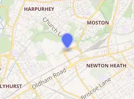The stadium no longer exists, and North Road has been renamed Northampton Road.[1] After a spell serving as playing fields for locals, Moston Brook High School was opened on the site.[12] A red plaque was attached to one of the school's walls, marking the location of the old stadium,[13] but it was stolen and not replaced.[14] Following the school's closure in August 2000, the site was chosen by the Northwest Regional Development Agency (NWDA) as the location of the North Manchester Business Park in 2002.[15][16]