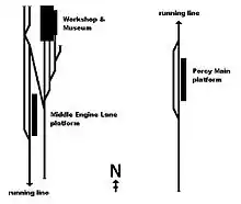 The running line of the railway consists of a single track line, with two open-air platforms at either end, both with a passing loop. The northern platform, "Middle Engine Lane", is just south of the museum building. The southern platform, "Percy Main", is immediately south of the point where the Metro crosses the railway, paralleling the length of Brunton Street, to which there is pedestrian access for passengers wishing to leave the train there.