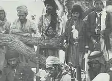 The new republican government was headed by Qadi Abdul Rahman Iryani, Ahmed Noman and Mohamed Ali Uthman. The Prime Minister was Mohsin al-Aini. Noman, however, remained in Beirut. He was doubtful of his colleagues reluctance to negotiate with the Hamidaddin family, preferring to expel it instead. On November 23, he resigned, and his place was taken by Hassan Amri.[91] Prince Mohamed bin Hussein told the country's chiefs "We have money, and you will have your share if you join us. If not, we will go on without you". The chiefs agreed to mobilize their tribes. 6,000 royalist regulars and 50,000 armed tribesmen known as "the Fighting Rifles" surrounded San'a, captured its main airport and severed the highway to the port of Hodeida, a main route for Russian supplies. In a battle twelve miles east of the capital, 3,200 soldiers of both sides were killed, and an entire republican regiment reportedly deserted to the royalists. Bin Hussein gave them an ultimatum: "Surrender the city or be annihilated".[92] Iryani went to Cairo for what the Egyptian official press agency called "a medical checkup". Foreign Minister Hassan Makki also left Yemen, leaving the government in charge of Amri. Amri declared a 6 p.m. curfew and ordered civilians to form militia units "to defend the republic". In Liberation Square, six suspected royalist infiltrators were publicly executed by a firing squad, and their bodies were later strung up on poles.[92]