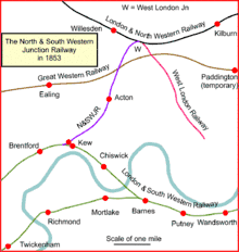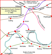 The proximity of the unconnected LNWR and LSWR railways immediately west of London led to a number of failed schemes, until in 1851 the North and South Western Junction Railway (N&SWJR) obtained its authorising Act for a 4½ mile line[note 1] from Willesden (N&SW Junction, near West London Junction), to Brentford (actually Kew Junction, later renamed Old Kew Junction).[1][2]