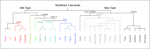 A long-time classification divided the family into Nakh and Dagestanian branches, whence the term Nakho-Dagestanian.[11] However, attempts at reconstructing the protolanguage suggest that the Nakh languages are no more divergent from Dagestanian than the various branches of Dagestanian are from each other,[12] although this is still not universally accepted. The following outline, based on the work of linguist Bernard Comrie and others, has been adopted by Ethnologue. An Avar–Andi–Dido branch was abandoned, but has been resurrected as the "New Type" languages in Schulze (2009, 2013) and Lak–Dargwa has likewise returned.