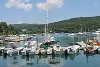 Boats docked at Northeast Harbor. The Asticou Inn is in view on the left of the picture